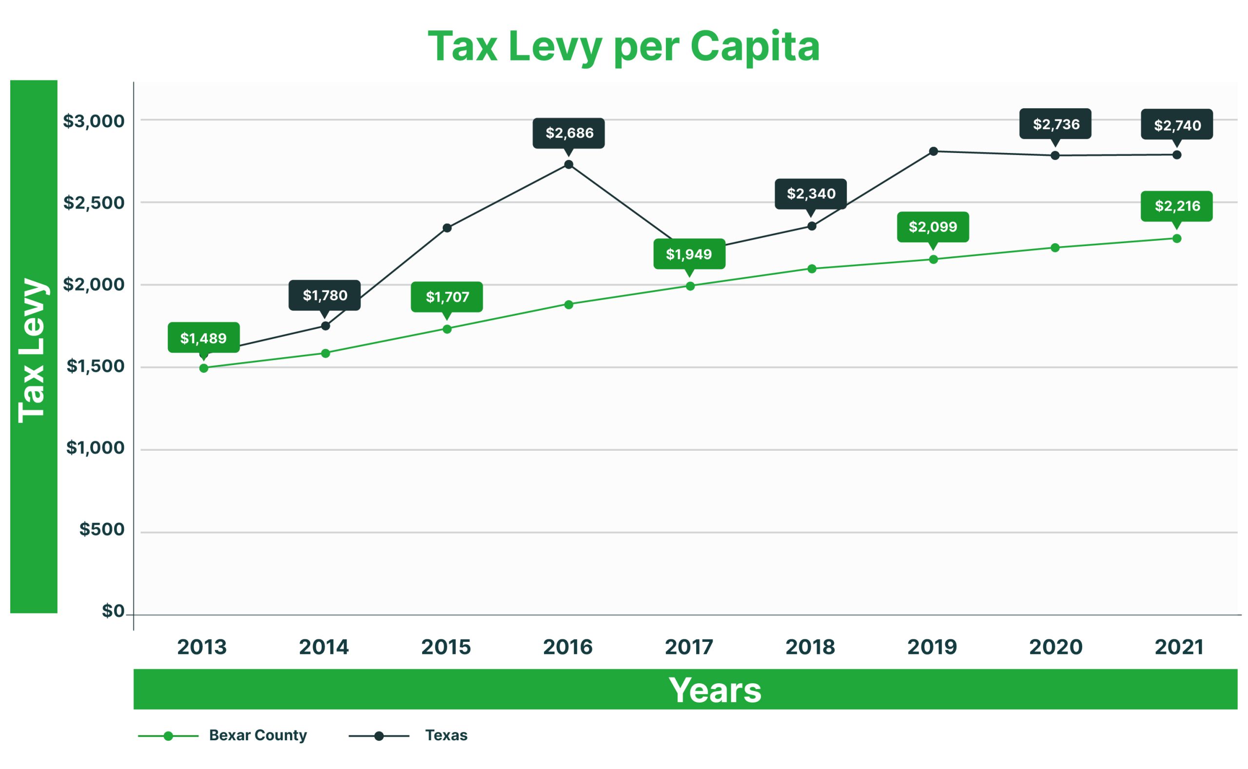Between 2013 and 2021, Bexar County saw a 49% increase in per capita property taxes, whereas Texas experienced a higher growth rate of 88%. Per capita property tax in Bexar County rose from $1,488 in 2013 to $2,216 in 2021. Despite starting at a lower level, the Bexar County per capita tax levy rapidly caught up with statewide figures. By 2021, the statewide property tax levy per person reached $2,740, slightly surpassing the $2,216 observed in Bexar County.