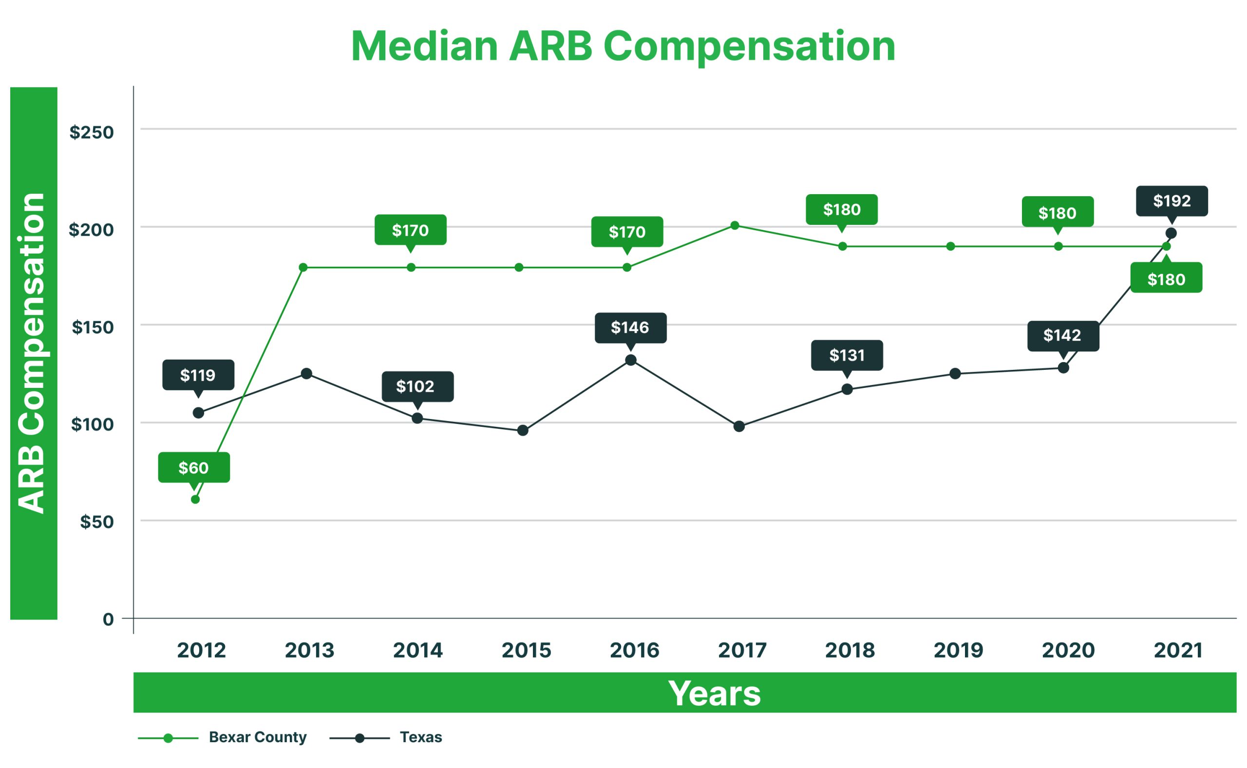 In comparison to the statewide average, Bexar County boasts a higher number of staff members dedicated to the Appraisal Review Board (ARB). Bexar Appraisal Review Board members assessed 14,878 tax properties, surpassing the statewide figure of 11,498. This staffing allocation aligns with the significant utilization of the Appraisal Review Board in Bexar County.
