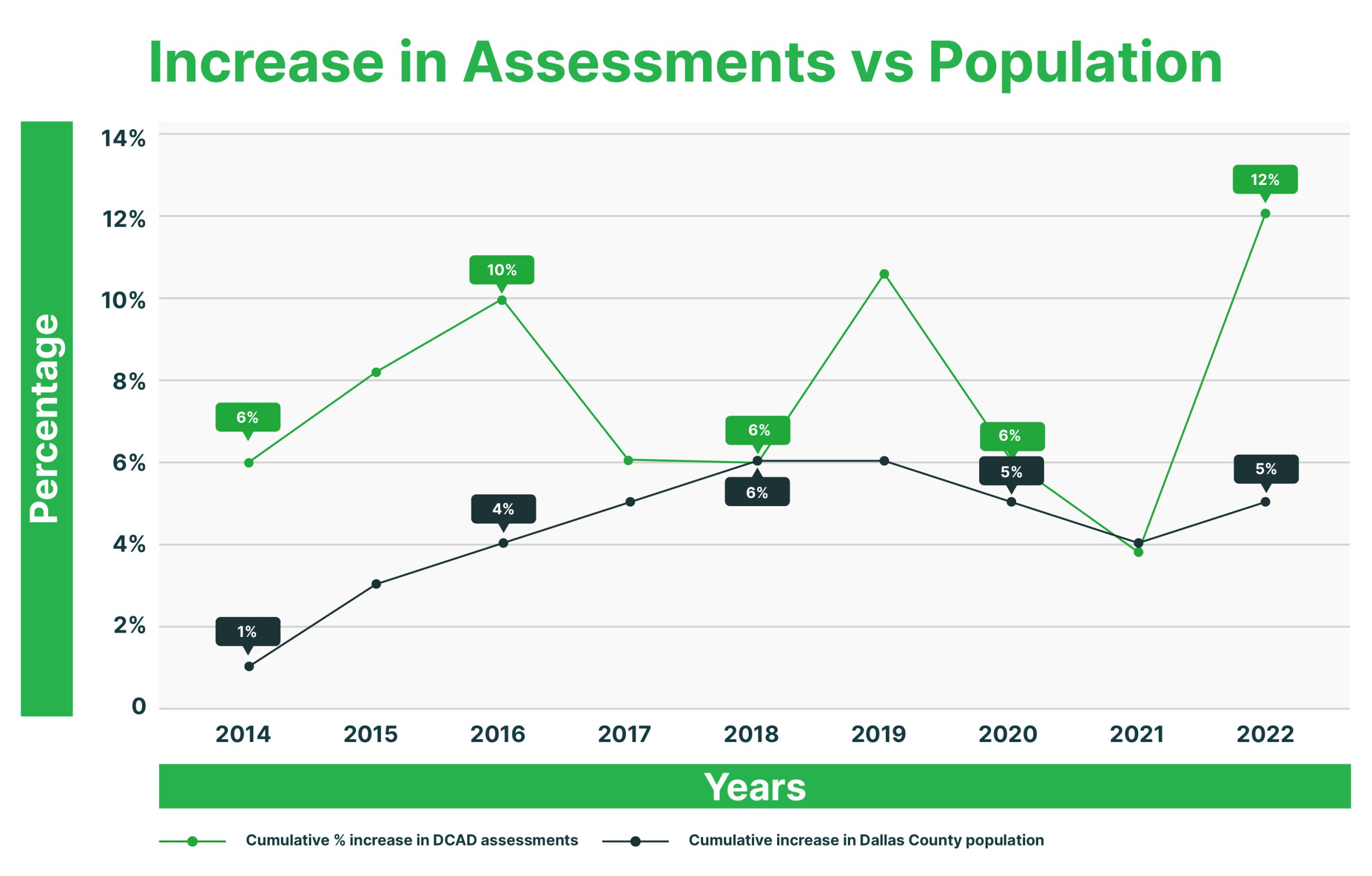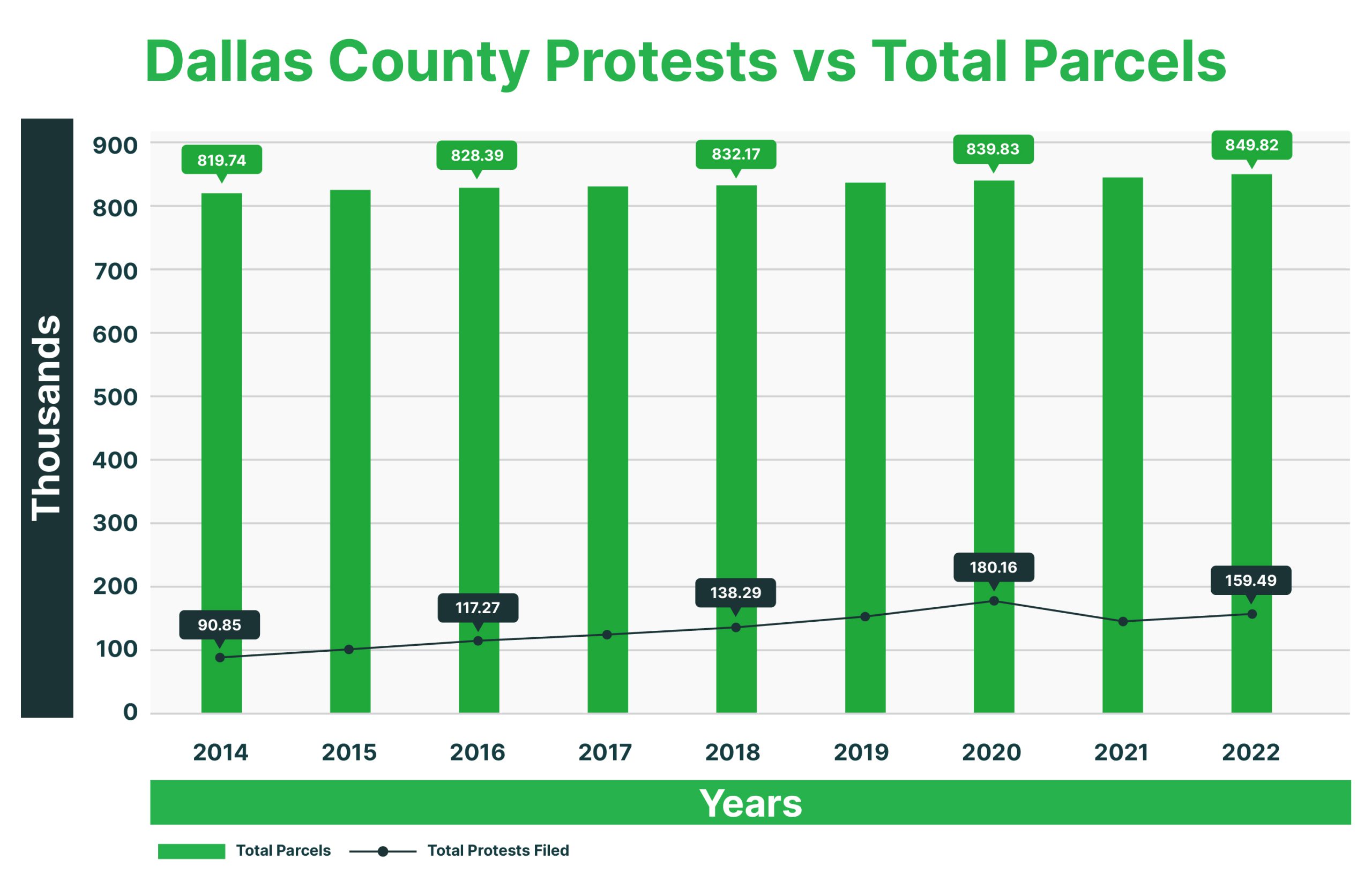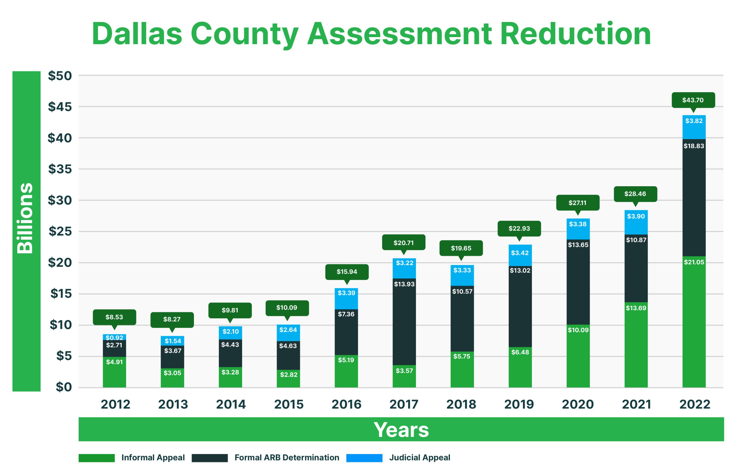 In 2022, property tax protests in Dallas County resulted in a reduction of property taxes by more than a billion dollars. Furthermore, these protests lowered the taxable value of property in Dallas County by $43.7 billion, encompassing both informal, ARB, and judicial appeals.