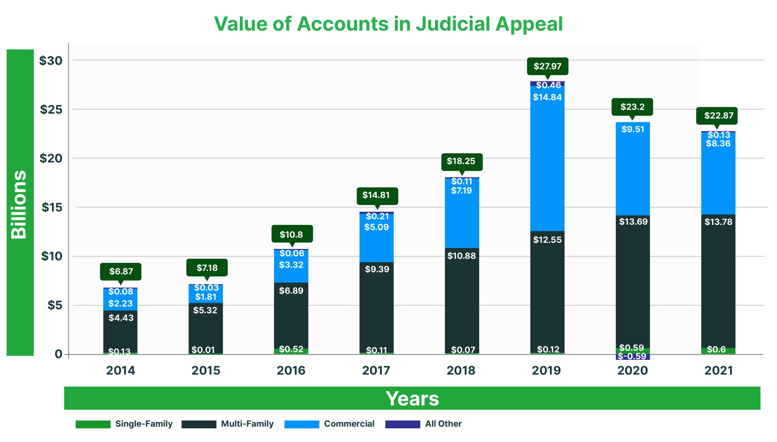 Most property tax consultants and property owners are dissuaded from pursuing judicial appeals with a value of less than $20 million due to the high costs involved. In lawsuits involving single-family properties, the mean value is approximately $4.1 million in Texas and $9.6 million in Tarrant County. In Texas, however, the mean assessed value of multifamily properties in judicial appeal accounts is $32.6 million, compared to $27.1 million in Tarrant County. In Tarrant County, the average value of commercial property subject to judicial review was $12.4 million in 2021.